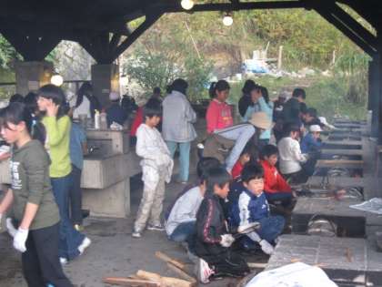野外炊事の活動に入りました。2回目の活動なので,食事係やかまど係の準備も手早くでき1時間もかからずかまどからご飯の炊けるいいにおいがしてきています。