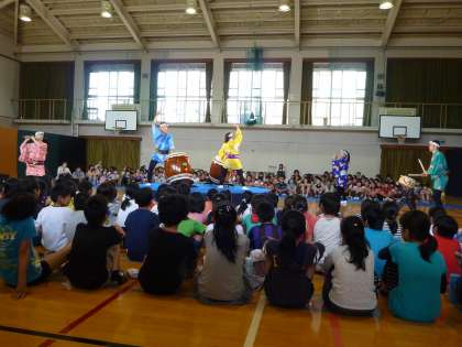 一橋,月輪,今熊野小学校の三校合同で,田楽座の「おまつりてれんどろん」という歌舞劇を鑑賞しました。いろいろな地方の祭囃子と踊りを紹介した歌舞劇でした。