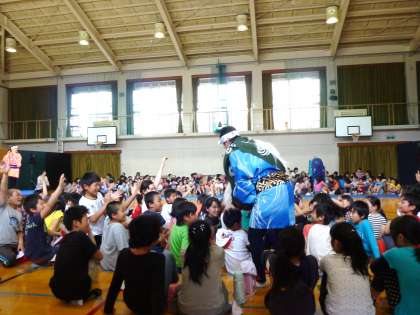 高学年の部では,最初,大きな掛け声や和太鼓などに子ども達は圧倒されたのか,少し緊張していたのか,「一緒に掛け声を…」と言われたのですが,なかなか大きな声が出ませんでした。しかし,その後の「鳥さし」の踊りがとてもユーモラスで子ども達の心をつかんだようで,徐々に踊りに引き込まれていき,盆踊りをみんなで踊る時には,全員一つになって元気に踊ることができました。最後に獅子舞の獅子に頭を噛んでほしい人を尋ねられると,大勢の子ども達が手を挙げていました。