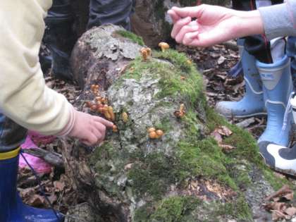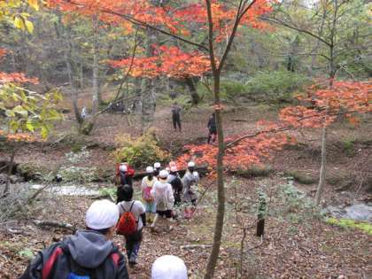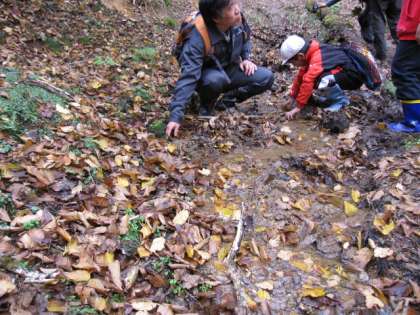 京大芦生研究林内の長治谷事務所に到着後,早めの昼食を済ませ,ガイドさんを先頭にいよいよ由良川源流を目指し芦生の森冒険ツアーに出発しました。湿地を通り,川のせせらぎを聴きながら江戸期の木地師の里を木々の間に想像し,そしてぶなの原生林。川の中を歩き,丸木橋を渡り,倒木を越えて進みました。その間に木や葉の香りをかいだり,木の実を食べたり,魚釣りをしたり,鹿の爪あとやツキノワグマの皮剥ぎを観察したり,クマの洞穴にも実際入ってみたりしました。ついに由良川源流に到着。手を浸し湧き出る水の感触を味わいました。残念ながら最終地点の杉尾峠から日本海はうす雲がかかり望めませんでした。子どもたちは日本海に届けとばかり「ヤッホー」「オーイ」と大きな声を響かせていました。日本の自然の豊かさを体全体で感じた1日でした。