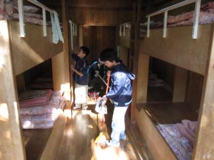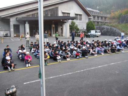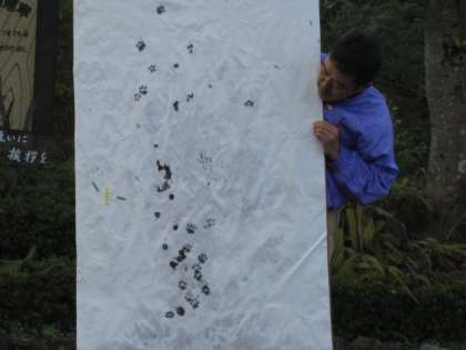 いよいよ最終日です。6時起床。寝具の整頓・シーツ返却・荷物整理・清掃を,今日は家にやっと帰れるとあって気が急くのか,いつもよりもうんと手早く段取りもよく進められました。昨日やってきた伏見板橋小学校とともに朝の集いを行いました。お互いの小学校を紹介しあった後,山の家の先生から昨夜工夫して採られた「イタチの足跡(墨跡)」を見せていただきました。子どもたちは山の家構内や芦生研究林での自然観察会通して,自然の見方や考え方を一段と深めてくれたことと思います。