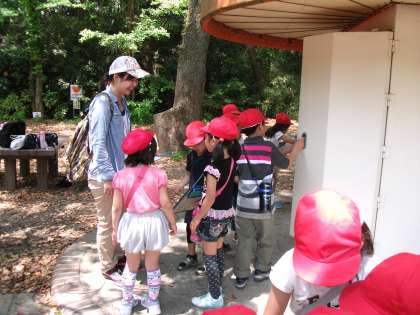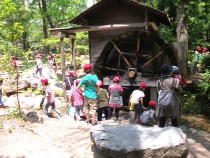1・2年生合同の班で,植物園の中をウォークラリーしました。少し道に迷った時もあったようですが,ポイントに来た時は,どの班もにこにこ笑顔でした。大きな水車におどろいたり,道を相談したり,咲いている花の色の問題を解いたりと,1・2年が仲良く協力でき,とても楽しい遠足でした。