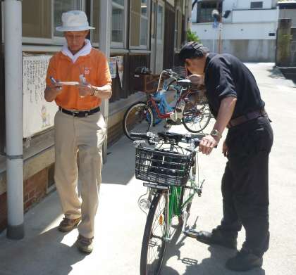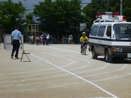 6月8日(日),PTAと交通対策協議会主催の自転車教室が行われました。正しい自転車の乗り方やヘルメット着用の大切さを東山警察署の方がお話されている時に,交通対策協議会の方々が,持ってこられた自転車を一台一台点検してくださいました。その後,一人自分の自転車に乗って,運動場に白線で道をかき,自転車を走らせる練習をしました。