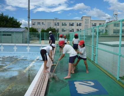 5時間目は5年生が,プール内の大きなゴミ(葉っぱなど)を取り,プールサイドをデッキブラシで磨きました。1年間使っていないプールは土も随分たまっていて,綺麗にするの大変でした。