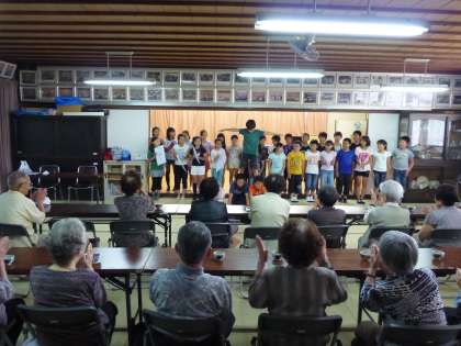 その後,『えがおがいっぱい』という歌を歌いました。この曲の歌詞は5年生が考えたもので,動物の鳴き声などの身振りを入れて歌うというものでした。お年寄りの方も一緒に手を振るなど歌に参加してくださいました。出し物が終わった後にアンコールの声をいただき,もう一度『えがおがいっぱい』動物バージョンをみんなで歌いました。会場が一つになった感じがしてとても楽しかったです。