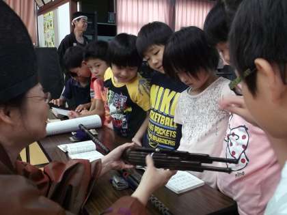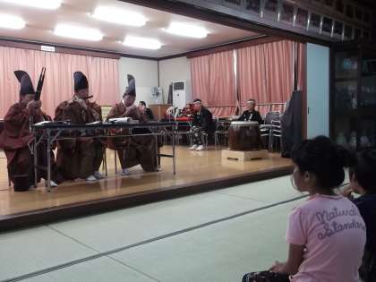 また,雅楽に使う楽譜や楽器もそばによって間近で見ることもでき子ども達はとても感動していました。