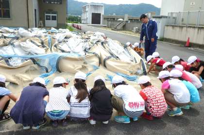 まず始めに,琵琶湖から疏水を通って取り入れられた水が,どのような状態なのかを見ました。最近は少し臭いが出てきているので活性炭を入れているとのこと,水が真っ黒で子ども達はびっくりしていました。ろ過するための砂も実際に触らせてもらって大喜びでした。そして,沈殿池でだんだん綺麗になって行く様子に,目を輝かせて見ていました。ろ過池の砂の洗浄では,機械を動かすと水がすごく濁っていき,しばらくすると透き通っていく様子にも,何回も驚きの声をあげていました。子ども達は,一つ一つの場所で食い入るように見ていました。