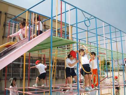 低学年は,先生の指導の下で,総合遊具で遊んでいました。