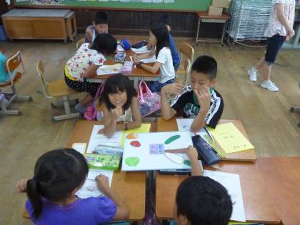 食べ物の「旬」について,子ども達は班ごとに話し合い,「春キャベツっていうから,キャベツの旬は春だ。」「夏に自分達がトマトやキュウリを育てたので,旬は夏だ。…ということは,土の上にできるもの旬は夏じゃないかな。」「秋は葉っぱの色は変わるね。わたしの家は,秋色の炊き込みご飯をよくするよ。…きっと,炊き込みご飯に入れるゴボウやレンコンは秋が旬だと思うよ。」「おでんの大根が美味しい。…あったかい食べ物なので冬だよ。…土の中でとれる野菜の旬は冬じゃないかな。」と,どの班も,とてもよく話し合っていました。