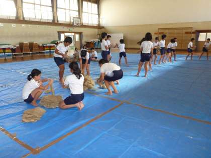 明日・明後日の両日,今熊野小恒例の造形遊びを体育館でします。本日,粘土の準備を5年生がしてくれました。力を合わせた手際よい活動で,あっと言う間に3つの山ができました。最後に,明日作品が作りやすようにと,全体を押さえて一つの塊にしていました。大量の粘土を使って,今年も子どもたちが想像力を膨らませ,すばらしい造形表現をしてくれることを期待しています。