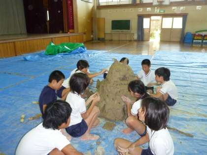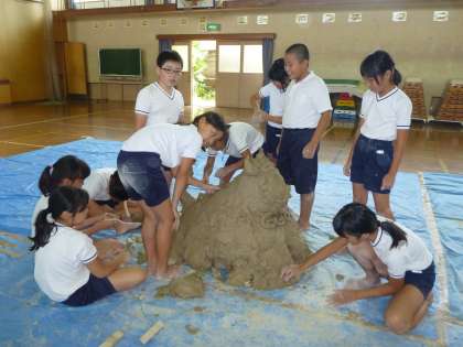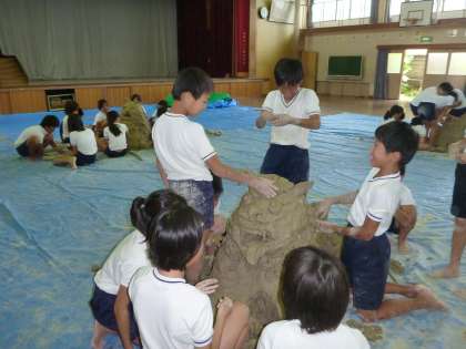 造形遊び,最初は5年生です。今年のテーマ—は『シーサー』,班ごとに相談しながら制作に取り組みました。今熊野の獅子を作ってきた子ども達,「シーサーではなくて,獅子になってきた。」と声をかけてくれて,「とても素敵,いいと思うよ。」と言うと,満面の笑顔で応えてくれました。どのグループの作品も,家の前に飾っておきたいと思うほど素敵に出来上がりました。