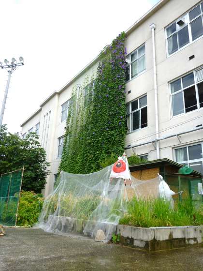 緑のカーテンの蔓が3階の屋上にまで達し,成長のすごさにびっくりしています。