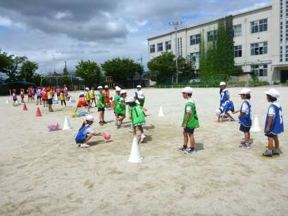 時折心地よい秋風が吹く中,1年生が体育で転がしドッチボールをしていました。自分たちで点数を数えるなど,とても上手にゲームを進めていました。