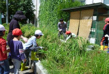 今年も稲がよく実り,雀がたくさん寄って来て,鳥よけの網の横から穂をつつき始めました。また,先日の大雨で稲穂が倒れ,田んぼの水に浸るようになったため,田が乾くのを待たずに,本日2年生が稲刈りをしました。