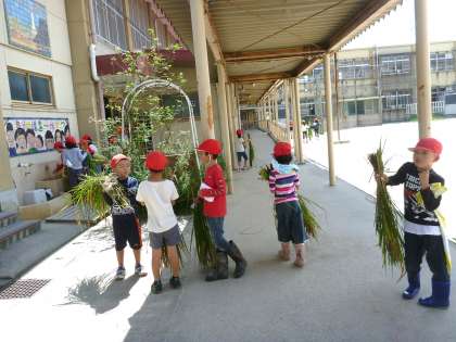 まず始めに,子ども達全員で田んぼの水抜きをしました。みんなで力を合わて水を汲み出したので,あっと言う間に田んぼの土が見えるようになりました。そして,一人ずつ株を持って鎌で稲を刈っていきました。初めての鎌体験でしたが,とても上手に稲を刈っていました。最後に,刈り取った稲の束を教室まで運びました。自分たちの刈った稲束を抱えて,満足気な顔で子ども達は教室に戻って行きました。