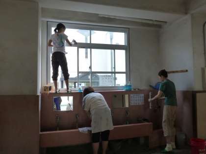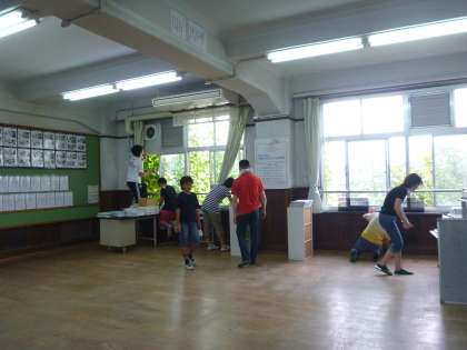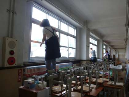 たくさんの保護者の方々が,子ども達の教育環境をよりよくしようと集まってくださいました。子ども達の手では届かない高い所や汚れのひどい所などの掃除をしてくださいました。保護者の方々のおかけで教室や廊下がみるみる美しくなっていきました。最後に床のワックスがけもして,学校中がピカピカになりました。
