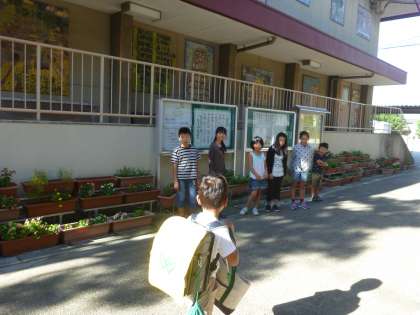 今週は,9月の人権・あいさつ週間です。当番の子ども達が東西の出入り口付近で,他の子ども達を「おはようございます。」と迎えていました。校内に,元気なあいさつの声が響いていました。