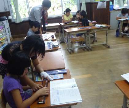 4年生が,算数でそろばんの学習をしていました。4年生では,そろばんを使って小数や大きな数の計算の仕方を学習します。そろばんの学習は久しぶりなので,珠の動かし方の練習をしてからの学習になりました。慣れていない子には,小さな珠を動かすのが大変そうでしたが,子どもどうしで教え合い,共に学ぶ姿が見られたいい時間でした。