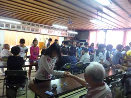 6年生は,交流で何をするかを自分たちで考え,今日の交流にのぞみました。まず始めに,校歌を3番まで歌いました。お年寄りの中には,作法室にかかっている校歌の歌詞を見ている方や,一緒に歌っている方もたくさんおられました。次にジャンケンゲームをしました。最後に,折り鶴など心を込めて折ったものを全員に渡しました。「とても上手に折ってあって感心しました。ありがとう。」という言葉を聞いて子ども達はとても喜んでいました。自分たちで交流を進められたという満足感が子ども達の顔に満ちあふれていました。