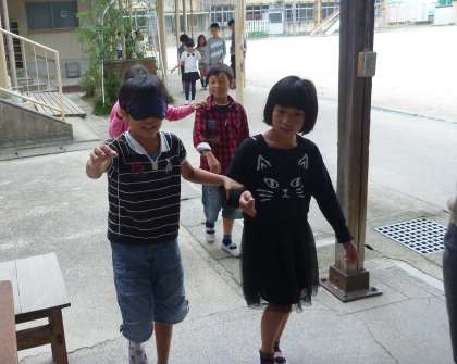 今日は,目の不自由な人の気持ちを少しでも理解し,自分たちができることを考えようという目的で,「アイマスク体験」をしました。アイマスクをつけて歩く側と付き添う側の二人一組で,教室と体育館までの間を交代で歩きました。アイマスクをした子どもたちは,「段差ある?」「真っすぐ行って大丈夫?」と,とても慎重に歩いていました。付き添う子どもたちも,「柱があるよ。もう少し右の方を歩いて。」「マットがあるし気をつけて。」と,ていねい声をかけていました。