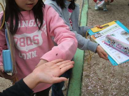 運動場を見ると4年生が理科で生き物の観察をしています。石をひっくり返して,虫を探していました。ダンゴムシをたくさん見つけていました。石の下にいることは,みんな知っていました。どうして石に下が好きなのかな。6年生になると詳しく学習します。