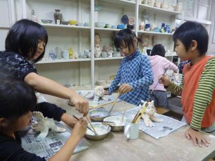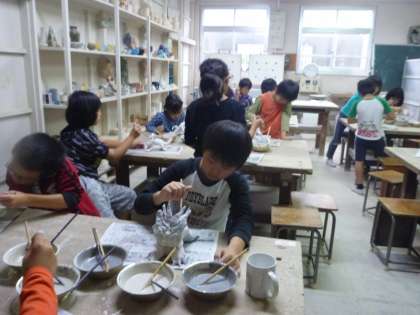 3年生が陶芸作品獅子の色付けをしました。自分の獅子はどんな色にしようか。目は,口は,胴体は…,と考えながら色をつけていました。塗り残しがないか,獅子をいろいろな方向から見て全体にしっかり色をつけていました。