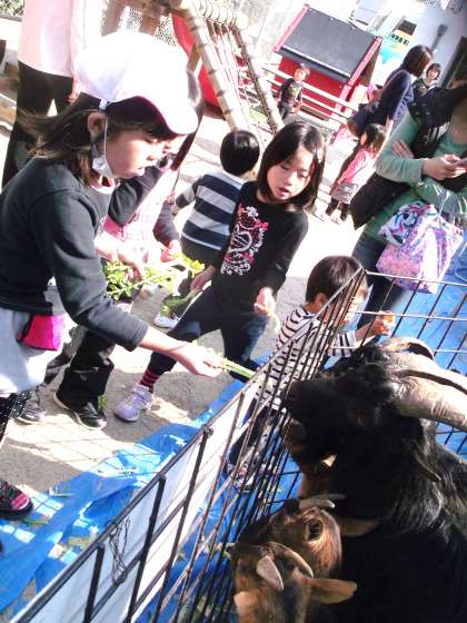 ウサギやハムスター,モルモット,ヒヨコ等々,撫でたり,抱っこしたりして子ども達は大喜びでした。自分達の背丈ほどあるヤギやポニーにも怖がることなく,餌をあげたり一緒に走り回ったりする姿も見られました。ヘビを首にかけてもらってご満悦という子が大勢いて,担任の方がびっくりしていました。