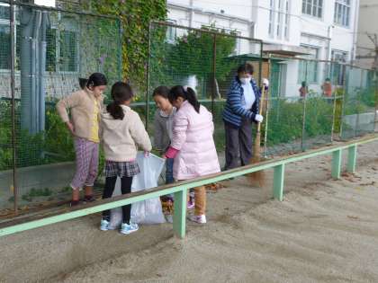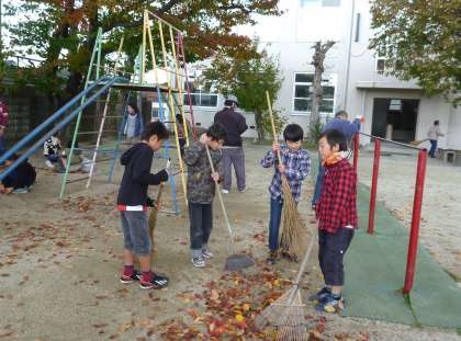 「くすの木」共同作業所の方々と,4年との交流清掃がありました。校庭の桜が葉を落とし始めていて,作業所の方が竹箒でさっと掃かれると,すぐに落ち葉の山があちらこちらにできました。4年生の子ども達は,集まった落ち葉を袋に詰めたり,自分達も竹箒を持って来て落ち葉を掃き集めたりして,一緒に協力しよく活動していました。
