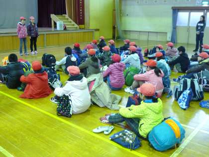朝から少しきつめの雨が降り,大きな荷物を持っての登校を心配しましたが,全員元気に登校でき,体育館で出発式を行いました。