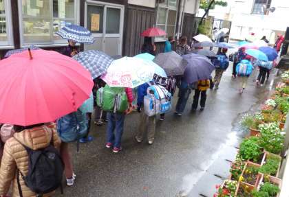 学校を出る頃には,雨も小降りになってきました。たくさんの保護者の方の見送りの中,子ども達が出発して行きました。