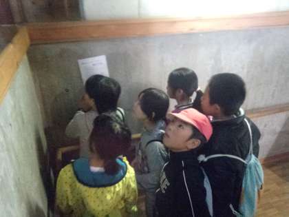 2日目朝の活動は,3校合同グループでの館内ラリーです。グループごとに10のポイントを巡ります。子ども達は,問題をあちらこちら探して,館内を楽しそうに探けんしていました。