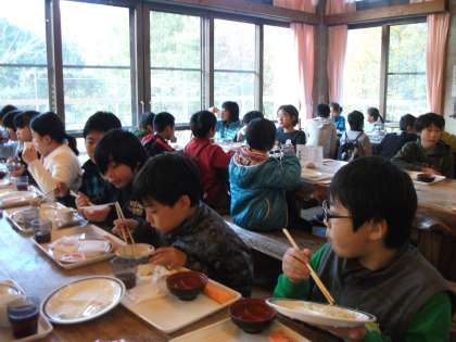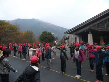 昨日は山登りをしたので,子どもたちは夜ぐっすり寝ていました。起床の音楽がなってもなかなか動き出す気配がないほどでした。