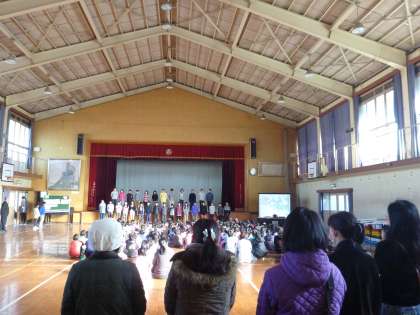 11月29日(金),5年生の感動体験発表会がありました。5年生は,「花背山の家」長期宿泊自然体験での様子を発表しました。「花背山の家」でする予定だった「手のひらを太陽に」を,全校児童の前で発表するなど,とても楽しい発表でした。発表の中に,4年生の時の「みさきの家」での様子と比べ,今の自分を見つめている言葉がありました。また,2回の野外炊事を通して,行動や気持ちが変化したことを発表する言葉もありました。子ども達は,「花背山の家」の活動を通して,自分の成長を実感することができ,そのことを感動体験で発表できたことは素敵なことです。