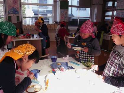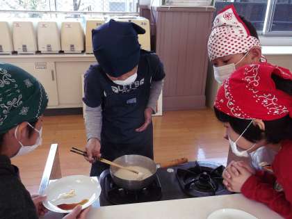 豆乳を鍋にかけてしばらくすると,薄い膜が張ってきました。その膜(湯葉)をすくい上げて子ども達は大喜びでした。出来た豆腐は少し柔らかかったですが,「高級な豆腐の味がする。」と,子ども達は話していました。