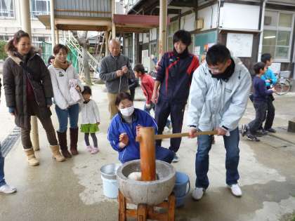 「よいしょ!」,威勢のいい掛け声が上がっています。お餅ができあがるまでの間,子ども達は,凧上げやコマ回し,けん玉などを楽しんでいます。