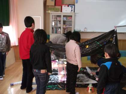 その後,みんなで黒いシートにシールを貼り,宇宙の周り作りました。出来たシートの上に一人ひとりが作った宇宙船を置くと,素敵な宇宙空間が出来上がりました。