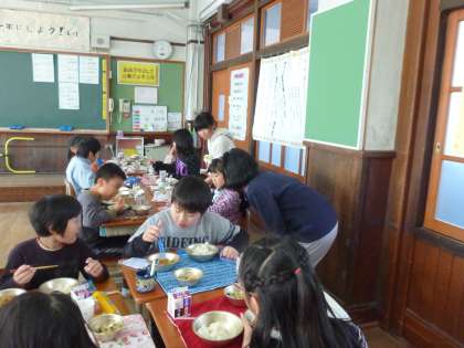 給食週間1日目の今日,年に一度のフレンドリー給食をしました。高学年の子ども達が,各学年の子ども達の食事量を考えながら配膳をしていました。大縄跳びなどですっかり仲良くなったので,どの班もとても楽しそうに給食を食べていました。給食調理員も教室を回り,子どもたちに感想を聞いていました。「おいしいよ。」とみんな笑顔で話していました。