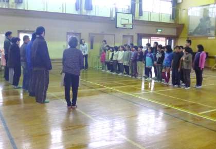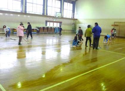「くすの木」共同作業所の皆さんと,4年生との交流清掃を行いました。今回が平成25年度,そして今熊野小学校での,「くすの木」共同作業所のボランティア清掃が最後なので,雨天時も交流ができるよう,体育館の掃除をお願いしました。一緒に掃除をし,体育館がとても綺麗になって,気持ちよく交流清掃が終わりました。