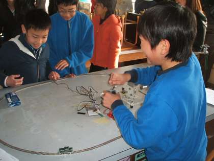 日新電気の先生が6年生の授業の後お昼休みに,手作り科学おもちゃをつかって自由に遊べる時間を作ってくださいました。