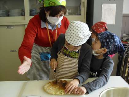 自由参観3,4時間目生活の時間に一年生は親子親睦会「ねぎ焼パーティー」をしました。1年生の子どもたちが,大切に育ててきたネギを使って,ネギ焼きをつくります。