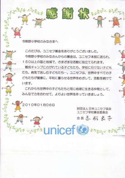 ユニセフから,感謝状が贈られてきましたのでお知らせいたします。