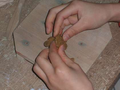 3年生はシーサーを作りました。制作が早く終わった人からミニシーサーを作っています。作り方の手順は覚えていますので,形も大きさも自分の好きなように作っていきます。小さくするととても細かい作業になります。粘土をくっつけるときには「どべ」を使いますが,小さい作品は,はみ出したどべをとり除くのが難しいので,筆で水を塗ってくっつけます。集中してがんばっていました。