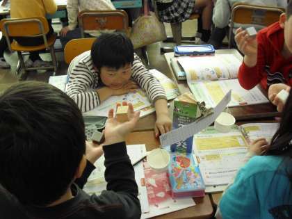 手に乗せた感覚がそれぞれ違うので,木が重いのか,プラスチックが重いのか予想を立てるときとても真剣に話し合っていました。