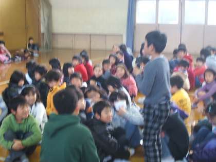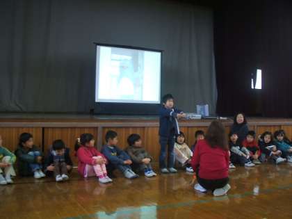 1年生が「いいこといっぱい」1年間の楽しい思い出を話しました。