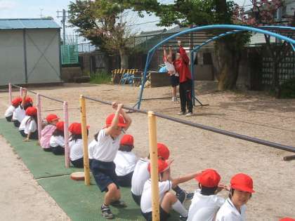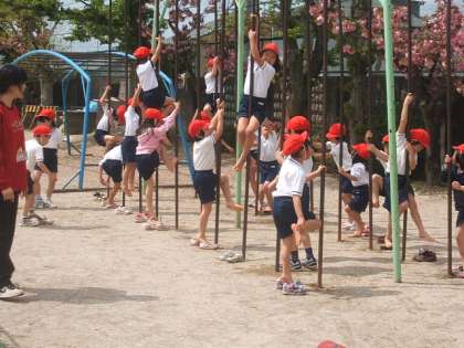 ジャングルジム,登り棒,うんてい等の固定遊具は,遊びながら,体が鍛えられます。自分の力だけで,体を支えて,バランスをとって,上ったり,滑ったりしていくのですから,失敗するとけがをする危険もあります。