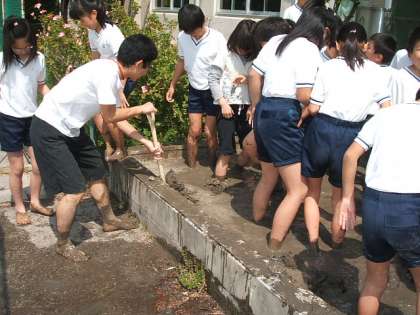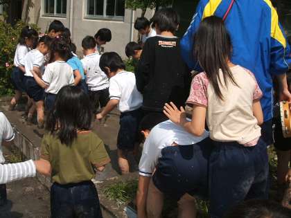 2年生と5年生が力を合わせて,田んぼの土を作っていきました。