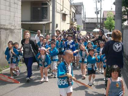 大人のみこしなどが続き,元気いっぱい子どもみこしがやってきました。