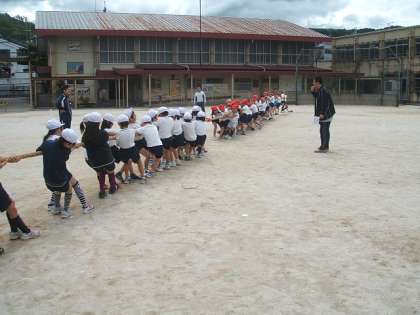 はじめに,運動場中央で練習した綱引きは,練習場所を移動した後,実際には綱を引けないので,エア綱引きで練習をしました。それでも大きな声で盛り上がっていました。