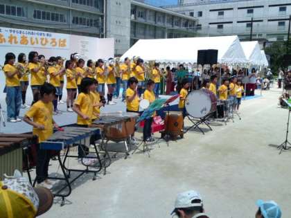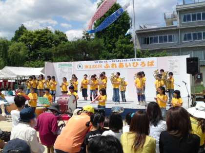5月30日(日)一橋小学校グランドで,東山ふれあい祭が行われ,一橋・月輪・今熊野三校合同バンド「メープルミュージックキッズ」が出演しました。3月に卒業生を送り出し,新メンバーを加えてのデビューのステージです。堂々とした演奏でした。大きな拍手をもらいました。