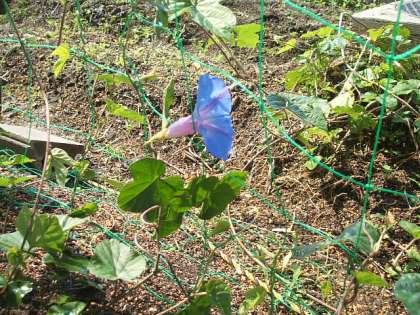 オーシャンブルーの花が咲きました。緑のカーテンになる前に花を咲かせてしまいました。ネットに届かなくて茎が地面を這うようにしているところに花が咲きました。伸びるのが難しいと感じると,早く花を咲かせ種の保存をしていくそうです。生きる力ですね。すごいですね。「そんなに,危機感をもってもらわなくてもいいですよ。」と思いながら,つるをネットにかけてやりました。